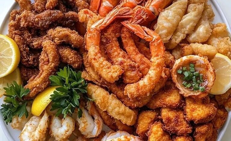 This Fried Seafood Platter is perfect for seafood lovers, offering a variety of textures and flavors in every bite. Great for sharing with friends and family! 🦐🐟🦑