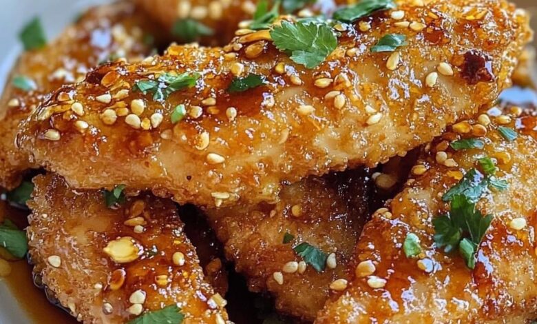 Garnish with fresh parsley before serving. Enjoy your sweet and savory chicken tenders!
