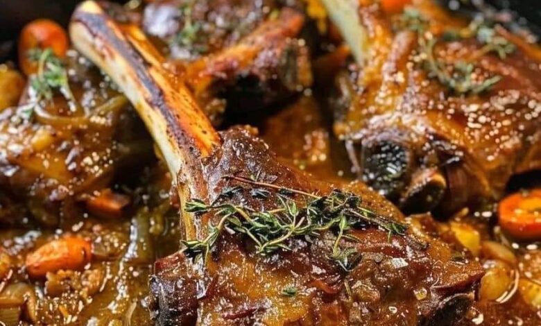 Transfer the covered pot to the preheated oven. Bake for 2.5 to 3 hours, or until the lamb shanks are tender and falling off the bone. You’ll know they’re done when the meat pulls away easily with a fork.