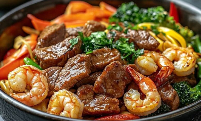 3οΈβ£ Sear the Beef & Shrimp: In a hot pan, cook beef slices for 2 minutes per side. Add shrimp and cook until pink.