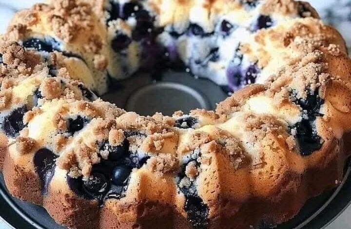 Mix streusel filling and spread out into the indented batter. Top with ½ of the blueberries.