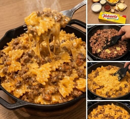 Tender bowtie pasta coated in a rich, creamy Velveeta cheese sauce with seasoned ground beef—this dish is cheesy, hearty, and pure comfort in every bite.