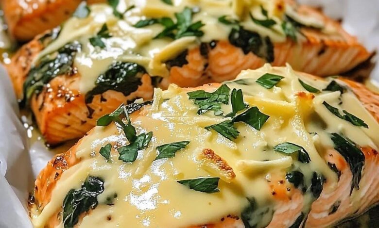 4. Layer the sautéed spinach on top of the salmon, then evenly sprinkle the mozzarella and Parmesan cheeses.