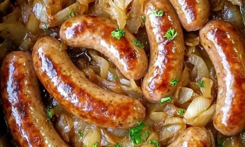 Transfer the skillet to the preheated oven and braise for about 30-35 minutes, turning the sausages halfway through, until they are fully cooked and the beer has reduced into a flavorful sauce.