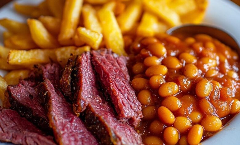Sliced or pan-fried corned beef served with crispy chips and a big spoonful of baked beans β simple, budget-friendly, and deliciously nostalgic.