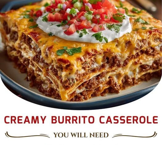 This Creamy Burrito Casserole is everything you love about burritosβ€”seasoned beef, beans, tortillas, and melty cheeseβ€”baked into a rich, creamy, cheesy casserole. Perfect for easy weeknight dinners or feeding a crowd!