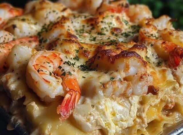 A luxurious, cheesy lasagna layered with garlic shrimp, Alfredo sauce, and tender pasta. Perfect for impressing guests or treating yourself.