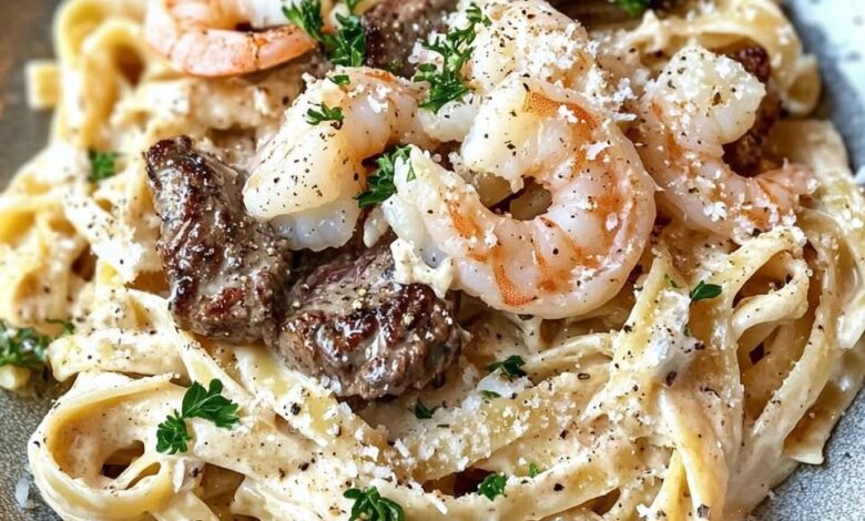 Pasta Alfredo aux Crevettes et Steak Cajun