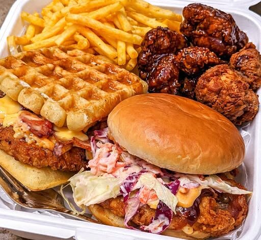 Crispy fried chicken stacked in a soft sandwich, paired with loaded fries, sticky wings, and a sweet-savory waffle sandwich—this is a full comfort food overload feast.