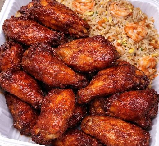 Plate crispy wings next to shrimp fried rice ๐Ÿ—๐Ÿค