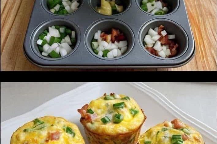 2. Grease a muffin tin and add diced onion, green pepper, and bacon to each cup.