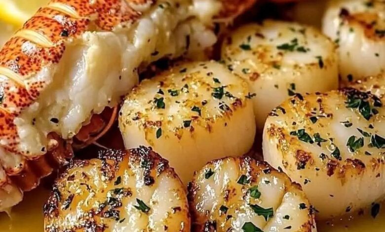 Serve: Plate the lobster tails and scallops together, drizzle with any remaining garlic butter from the skillet, garnish with fresh parsley, and serve with lemon wedges for a fresh, zesty finish.