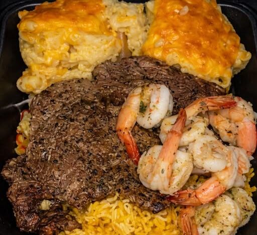 The ultimate surf & turf comfort plate — juicy steak, buttery shrimp, creamy mac, and fluffy rice all in one!