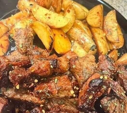 Serve the steaks with the roasted potatoes and garnish with chopped parsley.