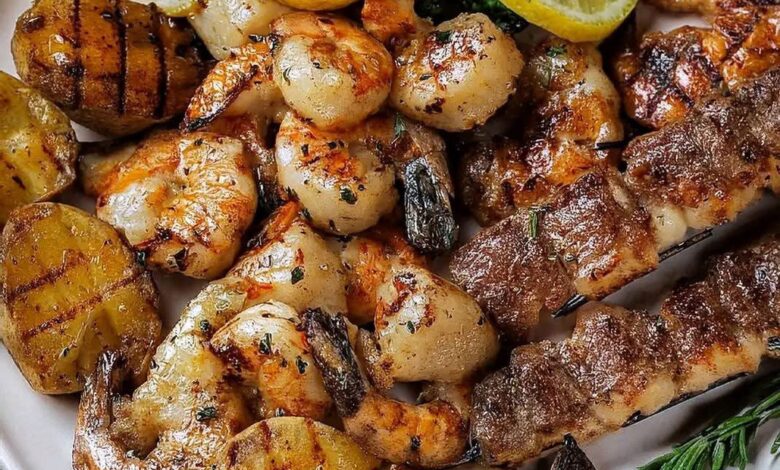 Remove the lobster tails and shrimp from the grill and place them on a serving platter.