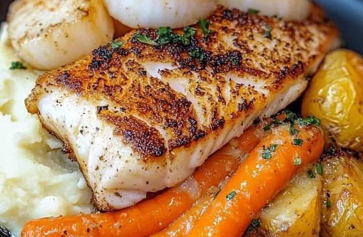 5. Assemble & Serve: Plate the mashed potatoes, then add the seared halibut and scallops on top. Serve with roasted carrots and potatoes on the side. Drizzle with extra butter and garnish with parsley.