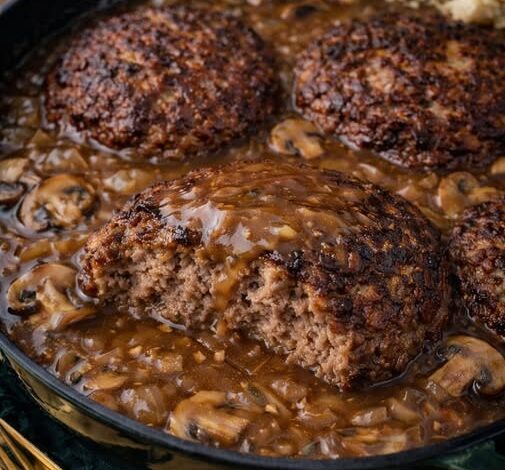 Juicy seasoned beef patties pan-seared until golden, then smothered in a rich onion and mushroom gravy. This hearty, affordable dish is packed with flavor and perfect for a comforting family dinner.