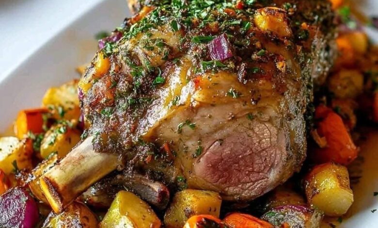 Juicy, tender lamb shank roasted with a flavorful herb crust, served with caramelized vegetables – a hearty and festive dish! 🍖✨