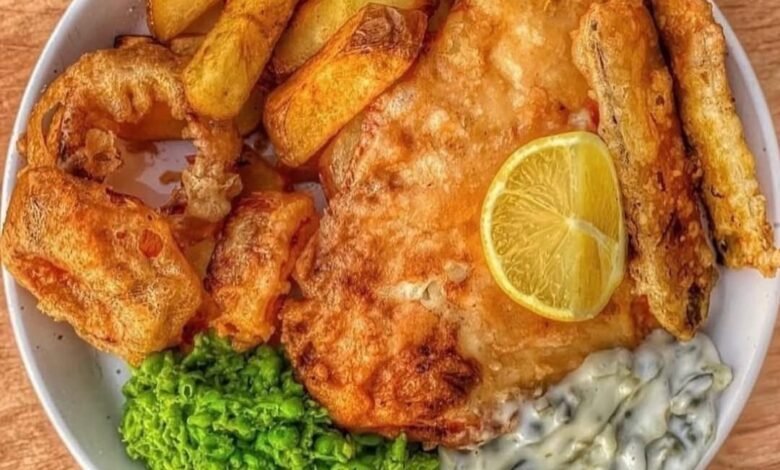 As it’s Friday, I thought I’d throw this golden oldie up! This is battered plaice, triple cooked chips, mushy peas, tartare sauce, onion rings and some battered gherkins too.
