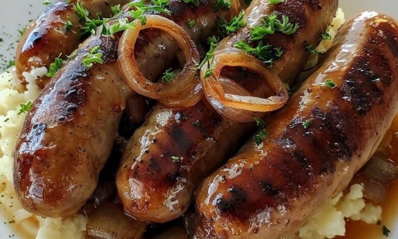 On each plate, place a serving of Colcannon Mash, then top with the cooked bangers. Arrange the crispy onion rings alongside the sausages.
