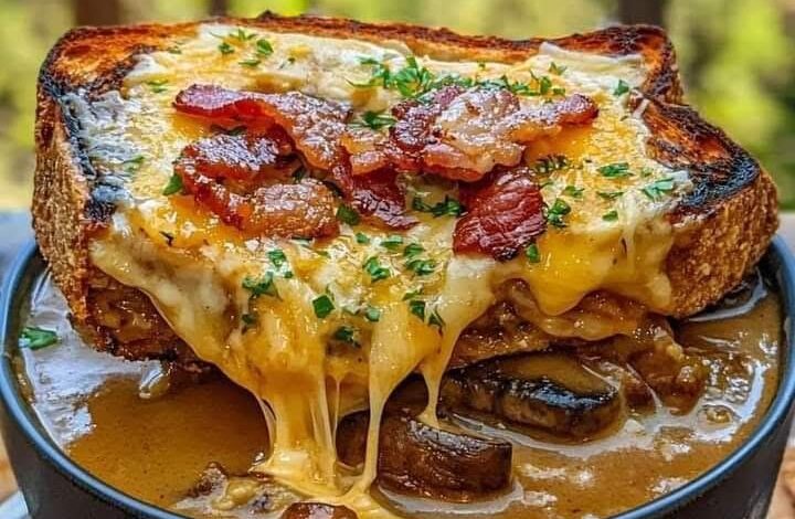 This rich and savory Mushroom & Caramelized Onion Soup is bursting with earthy mushroom flavors, sweet caramelized onions, and a hint of smokiness from crispy bacon. Served with gooey cheesy toasties, it’s a cozy, comforting meal ideal for chilly days.
