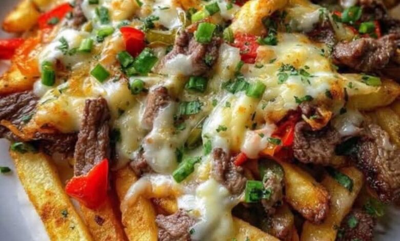 On a large serving plate, spread the hot fries in a single layer. Top generously with the steak and veggie mixture. Drizzle the cheese sauce over the top, or layer shredded cheese and broil for 2-3 minutes until melted and bubbly. Sprinkle chopped green onions and fresh parsley on top.