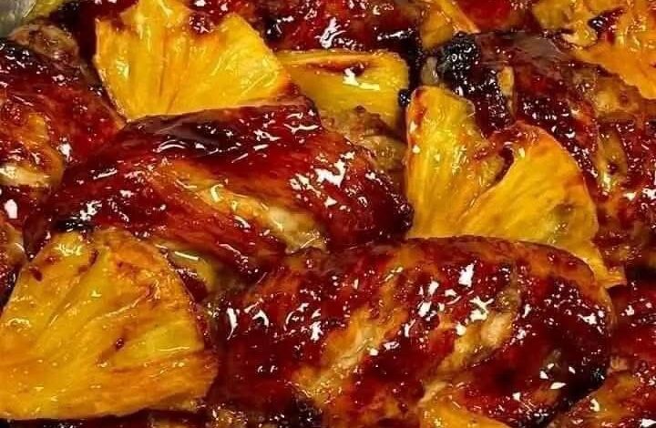 In a saucepan, heat the remaining marinade over medium heat. Add pineapple chunks and bring to a simmer.