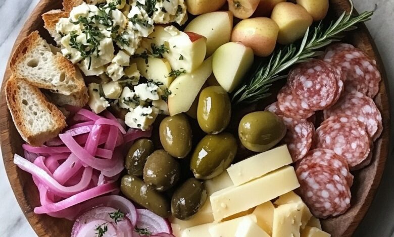 1. Arrange cheese, pickles, fruit, and bread on a plate.
