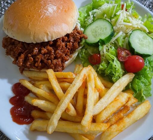 Sloppy joe is a classic American-style comfort sandwich made with seasoned ground beef simmered in a sweet and tangy tomato sauce, served in a soft bun. Paired with fries and salad, it becomes a full restaurant-style meal ๐Ÿฝ๏ธโœจ