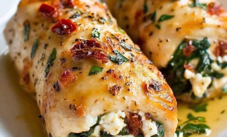 Spoon the spinach and feta mixture onto each chicken breast and roll tightly, securing with toothpicks.