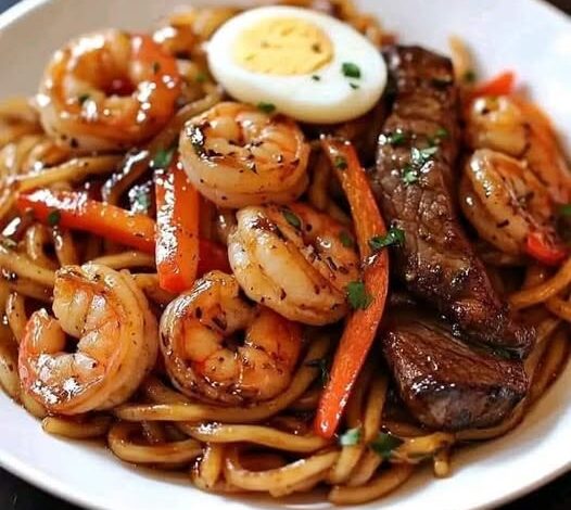 This dish combines seared steak and succulent shrimp with stir-fried noodles in a rich garlic-soy sauce. It’s fast, flavorful, and loaded with protein — better than takeout 🍜✨