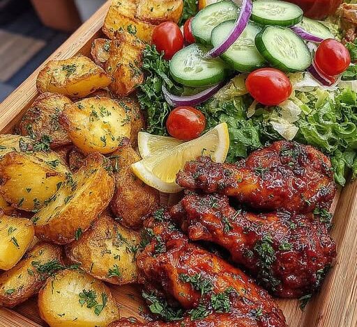 This Sticky Chicken Wings Plate is the ultimate comfort combo—sweet and savory glazed wings, golden crispy fries, and a refreshing fresh salad. Perfect for game nights, casual dinners, or viral food content, this plate delivers bold flavor, crunch, and freshness in every bite!