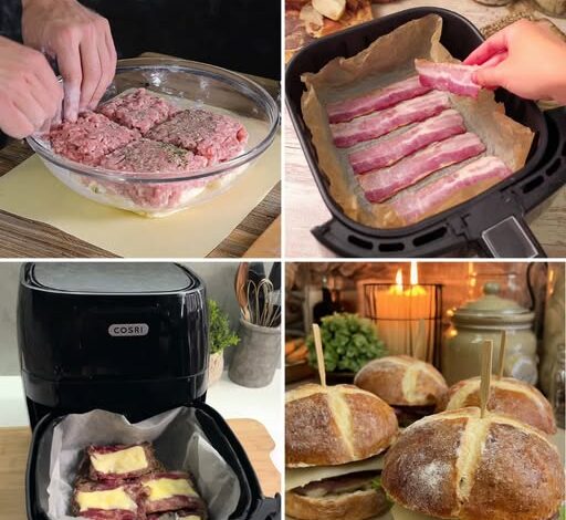 Smoky crispy bacon outside, juicy beef inside, and molten cheese in the center—this is next-level burger comfort with air fryer convenience 🤤🔥