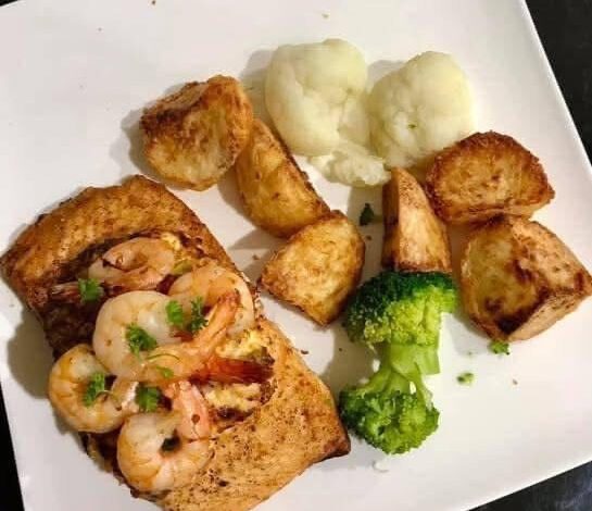 Air fry 180C/360F for 8 minutes and check if done. The salmon should be paler in colour and will flake if tested. If not done set air fryer for another 5 minutes at 200F/400F and commence air frying. Stop when 3 minutes left and top the sauce with remaining prawns and complete air frying. This salmon took 13 minutes in total air frying time.