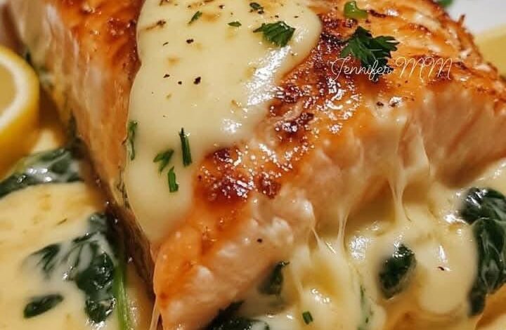➤6. Pour the creamy sauce over the baked salmon and serve garnished with fresh parsley and lemon wedges.