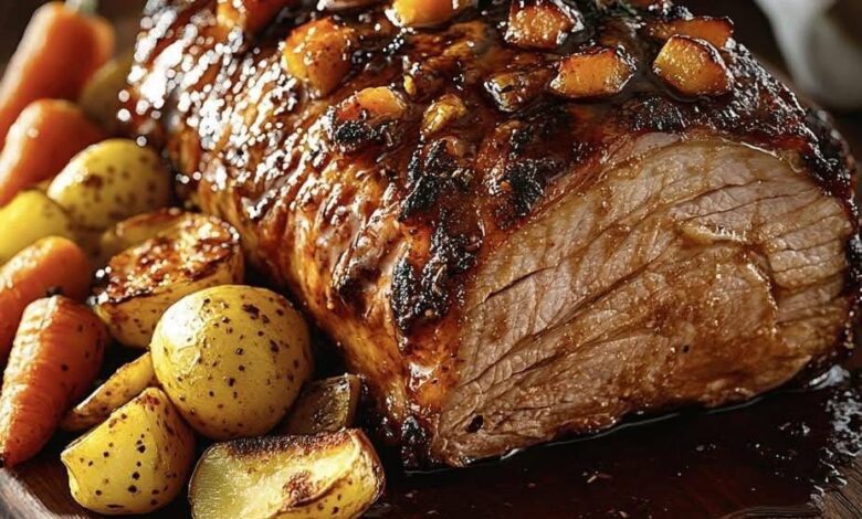 8. Serve: Slice the pork and serve it alongside the roasted vegetables, drizzling some of the cooking juices over the top for added flavor.