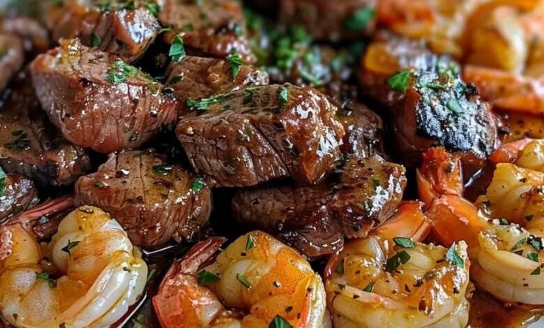 Return steak bites to the pan, toss with shrimp, and melt in remaining butter. Squeeze lemon juice over the top and stir in parsley.