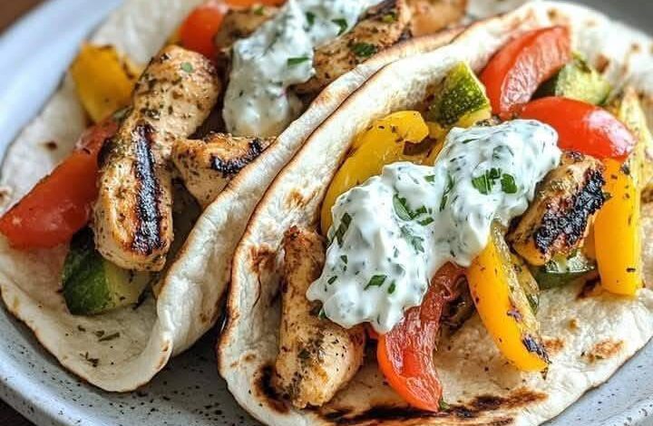 Warm the pita bread on the grill for a minute. On each pita, layer sliced grilled chicken, fresh veggies, and a generous dollop of tzatziki sauce.